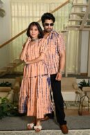 This Peach Printed couple matching outfit includes a women?s flowy cotton midi dress and a men?s short-sleeve printed shirt. Designed with cheerful yellow floral prints, this set is perfect for summer outings, casual gatherings, or twinning on vacations.